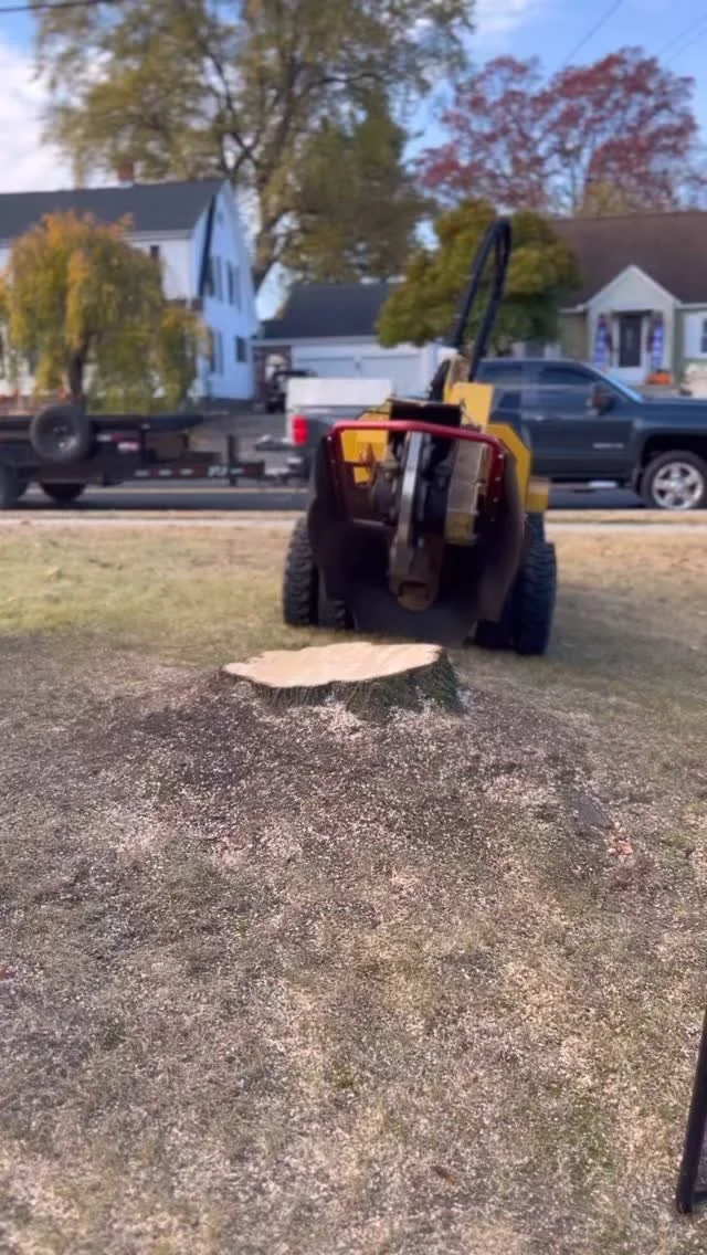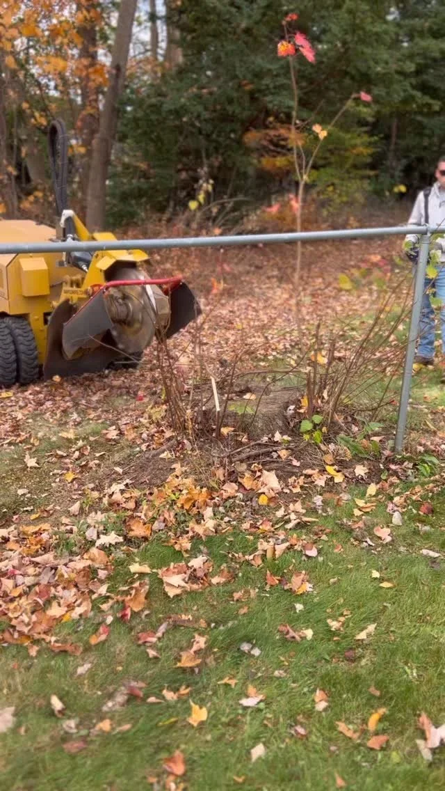 Stump grinding, surrounding area cleaned up, and wood chips discarded on property